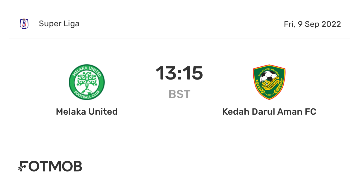Kedah 0 - 3. Melaka United is going head to head with Kedah starting on 9 Sep 2022 at 1215 UTC. Melaka United vs.